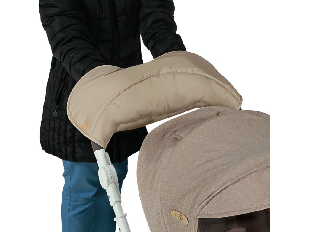 Mušle chrání vaše ruce před nepříznivými povětrnostními podmínkami a usnadňuje péči o dítě - už nemusíte nasazovat a svlékat rukavice. Mušle se zapíná na druky na kombinované rukojeti vozíku nebo saní, díky čemuž si dobře udržuje svoji polohu. Vnější část je pokryta nepromokavým materiálem, zatímco vnitřní vrstva je měkká a teplá „beránka“.